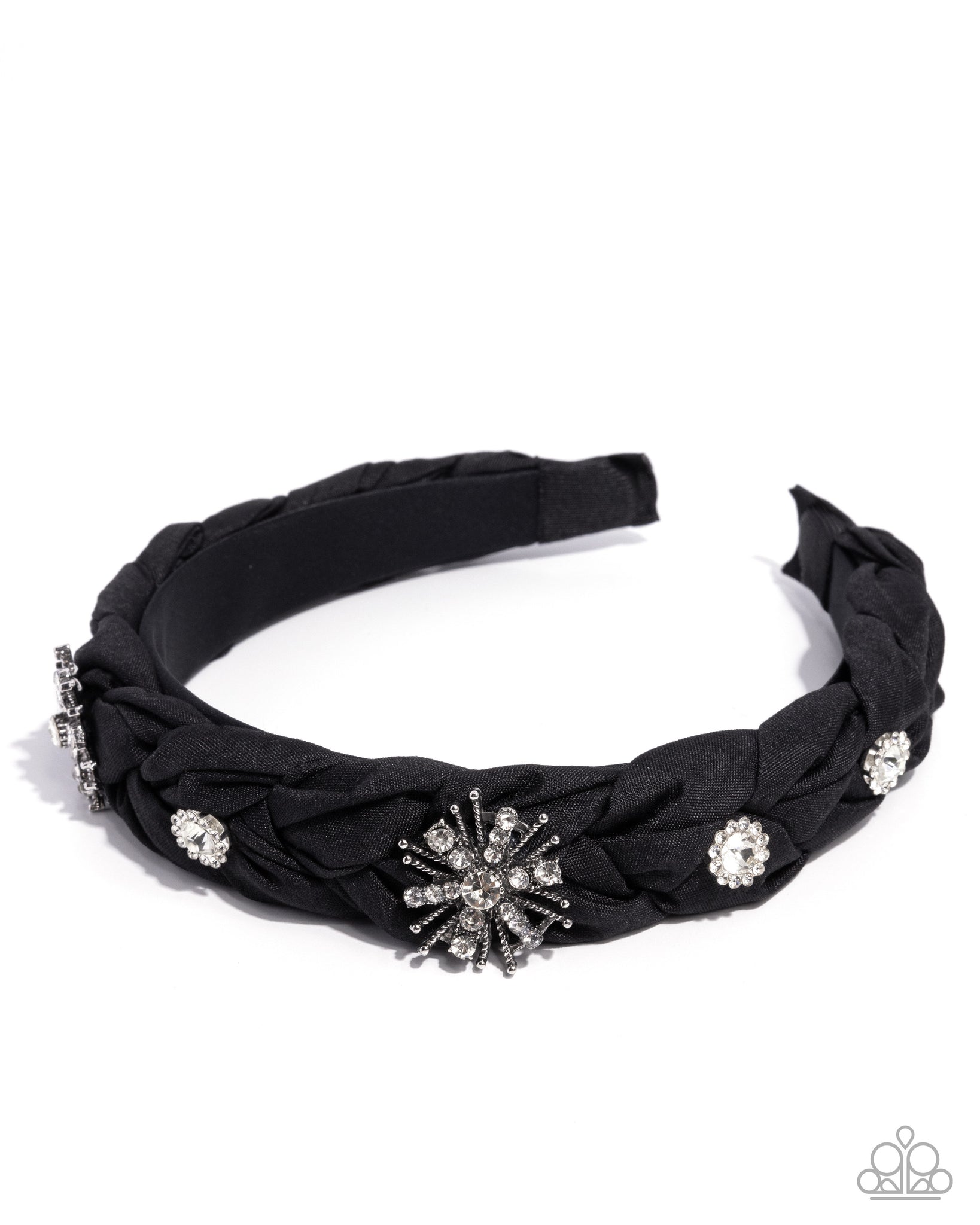 Featuring a braided pattern, a collection of white rhinestone and gem-embellished silver flowers alternate in size and dimension atop the front of a black ribbon atop the head, evoking a polished preppy look.