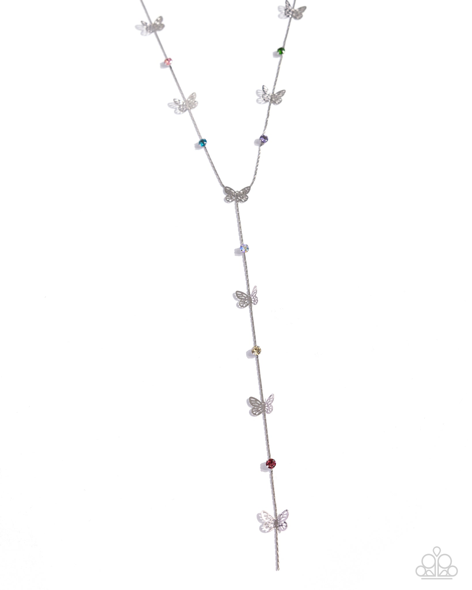 Fluttering along a dainty Boston Link chain, airy silver butterflies loop and extend below the collar for a whimsical display. Multicolored faceted round gems alternate between each butterfly along the silver chain for a touch of light-reflecting dazzle and color. Features an adjustable clasp closure.