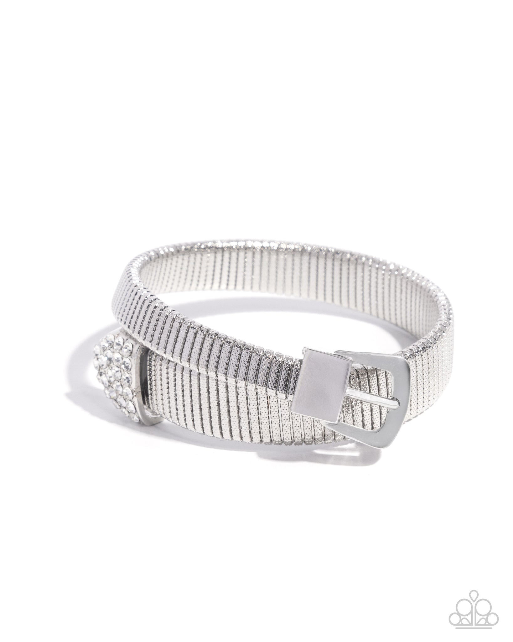 Dotted with tactile texture, a collection of silver bars are buckled in place across the front of the wrist beside a white rhinestone-dusted buckle for an edgy elegant cuff. Features a flexible design that makes it more accessible.