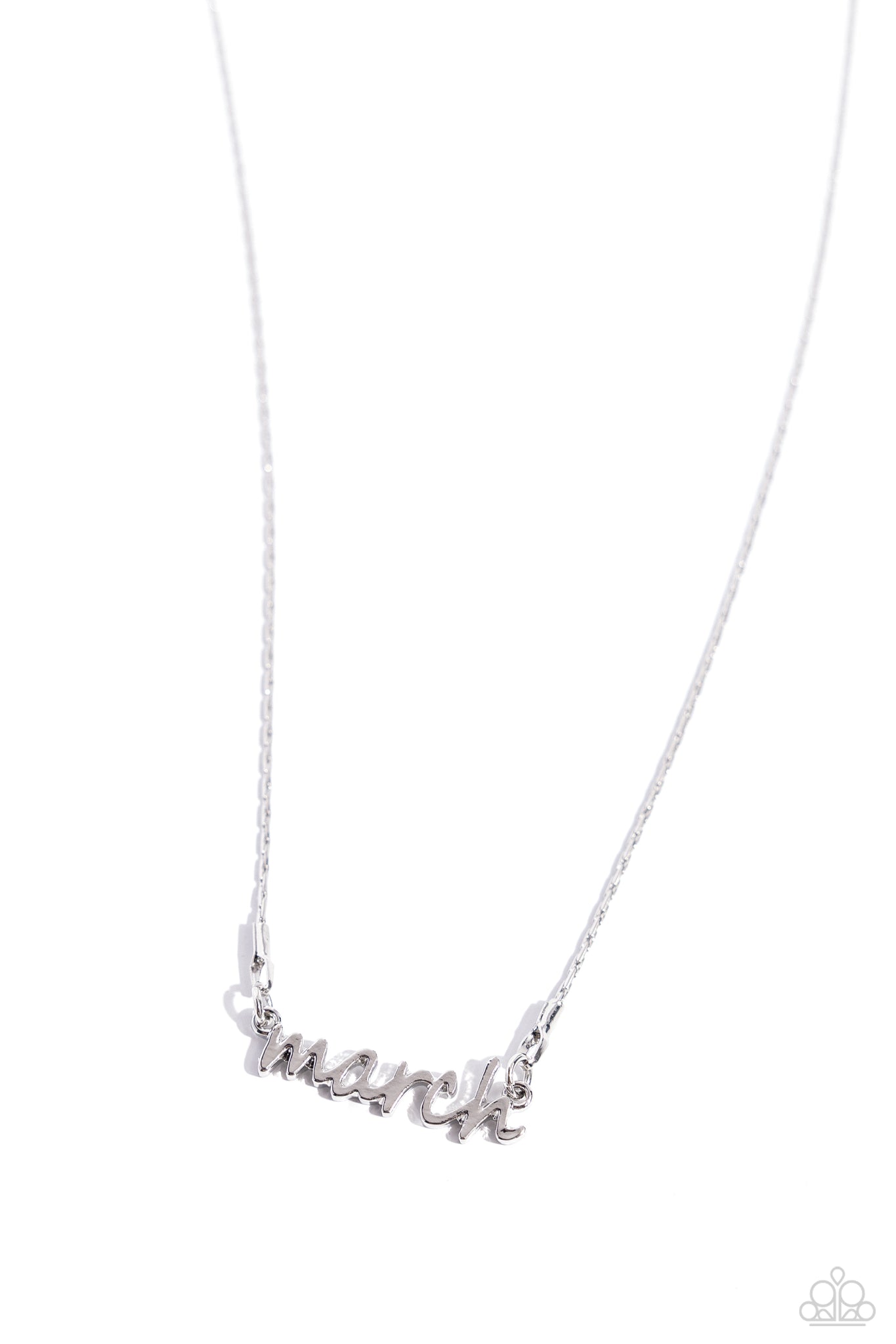 Featuring a cursive font, the word March is set in the center of an abstract silver chain for a birth month-inspired simple statement. Features an adjustable clasp closure.
