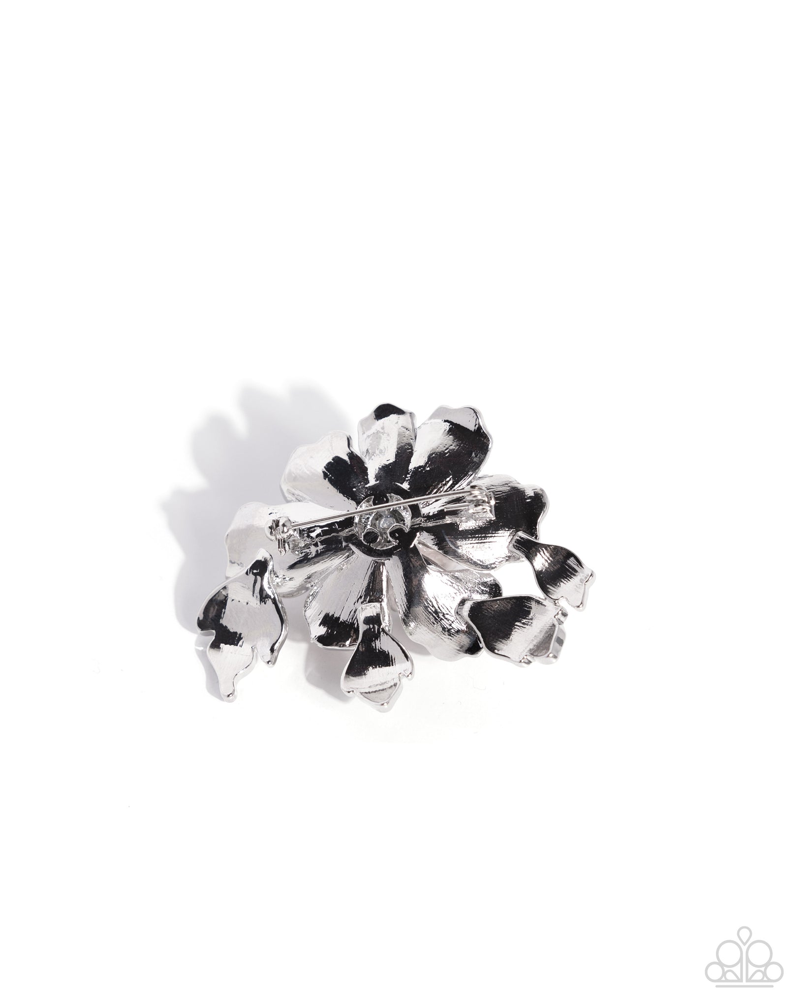 Featuring a white pearl center, silver crimped three-dimensional pink pearl-painted petals flair out and bloom atop green-painted leaves and white rhinestone-dusted silver leaves for a wildly whimsical centerpiece. Brooch measures approximately 1 1/4" in length and 2" in width.