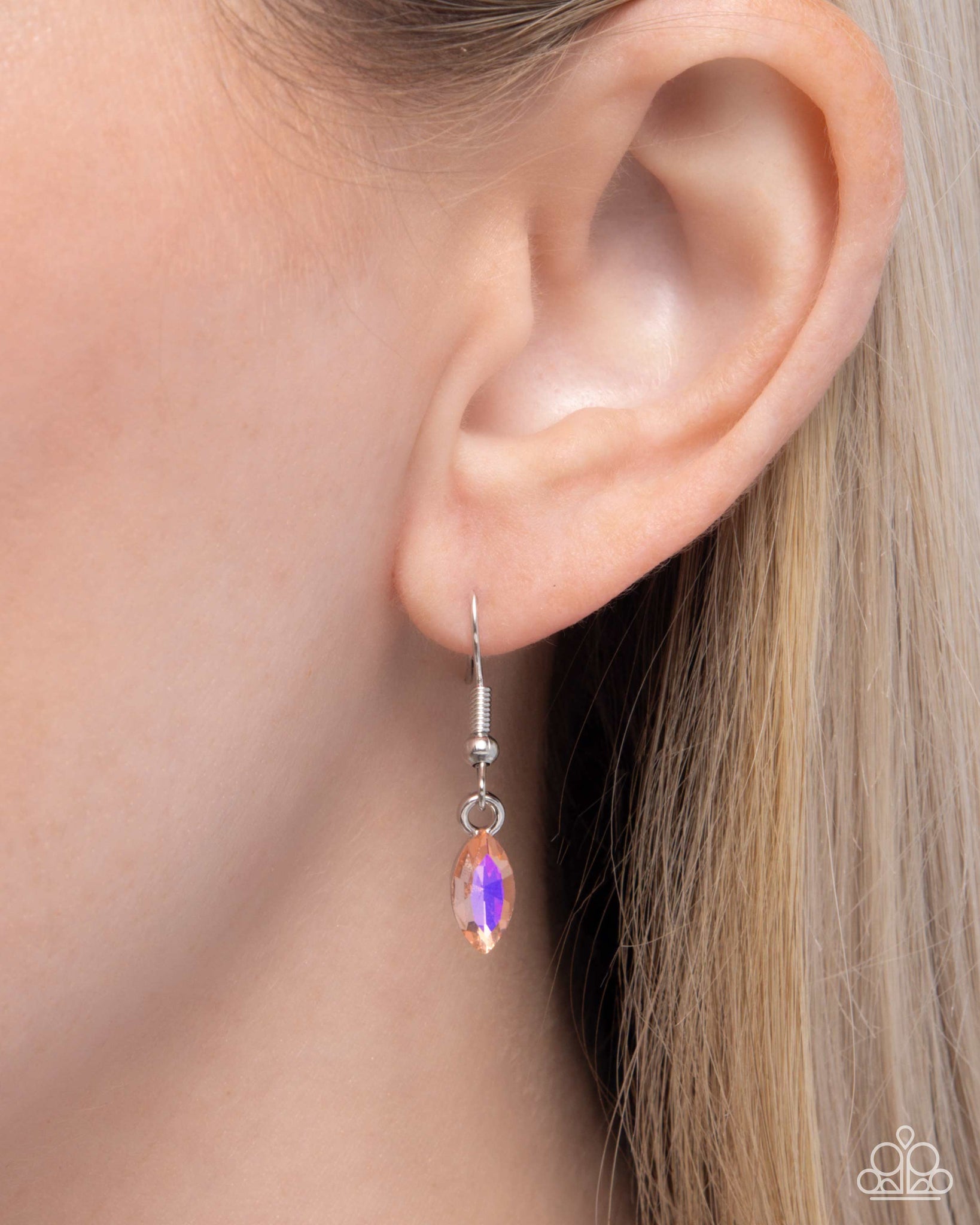 A silver chain showcases a floral-inspired centerpiece featuring marquise-cut green rhinestone leaves and iridescent light peach rhinestones forming a radiant flower. A sparkling iridescent gem accents the center of the design, adding a touch of brilliance. Features an adjustable clasp closure.