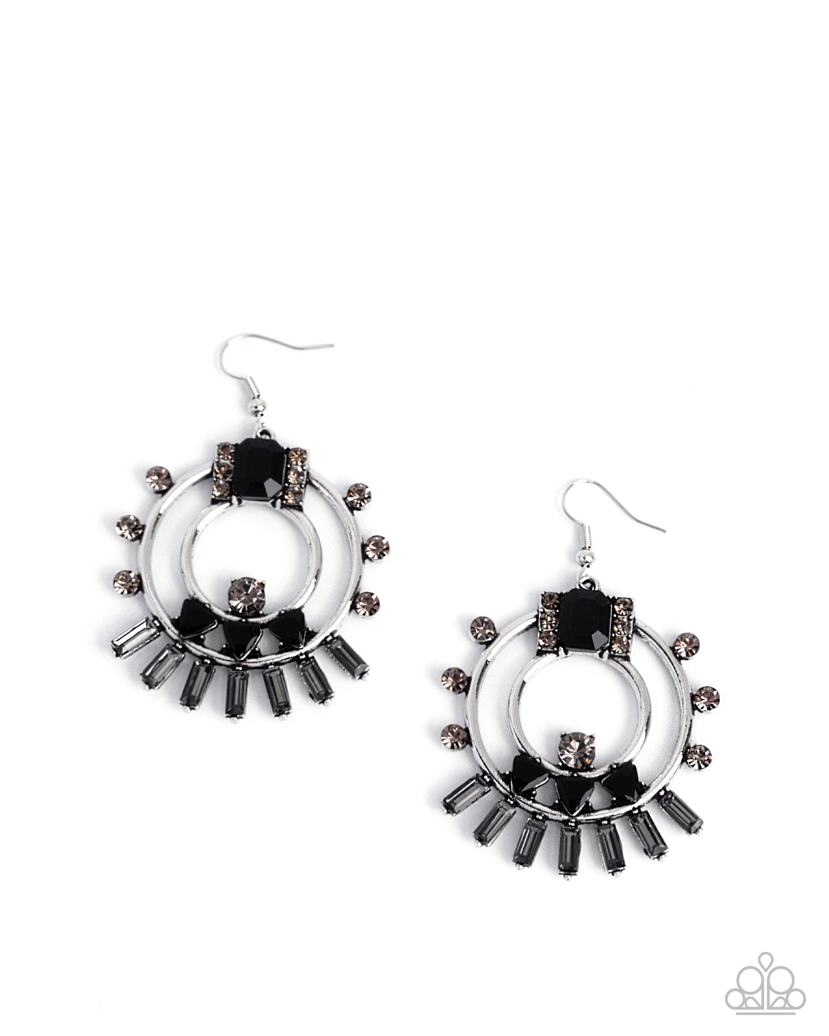 Etched in glistening texture, a duo of silver rings, sporadically dotted with smoky round and emerald-cut transparent black gems, a trio of triangular-cut black gems, and a solitaire, larger smoky rhinestone are threaded along an emerald-cut black gem with a trio of smoky rhinestones bordering it, layering into a dizzying hoop. Earring attaches to a standard fishhook fitting.