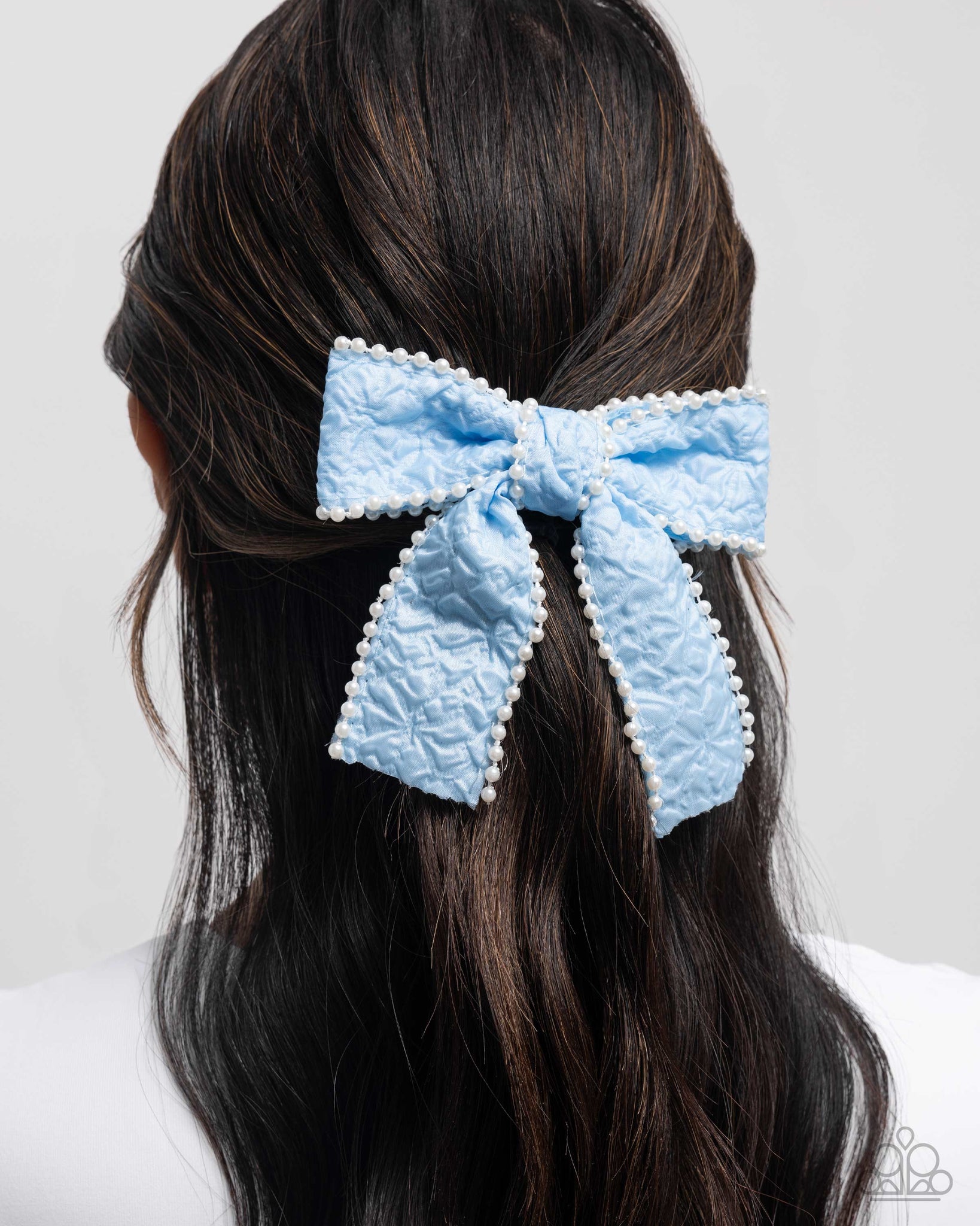Lined with glossy white pearls, a textured, light blue ribbon ties into an adorable bow for a chic display. Features a standard hair clip on the back.