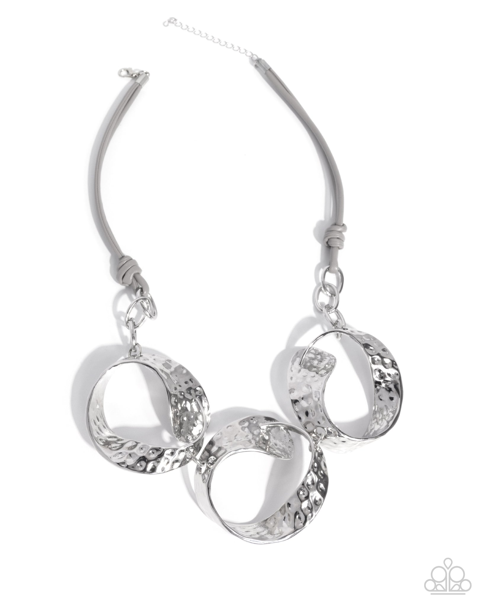 Hammered silver frames curl into chunky circles, connecting them as a trio with silver rings. The silver circles are suspended from gray leather-like cords that provide a modern contrast to the metallic elements. Features an adjustable clasp closure.
