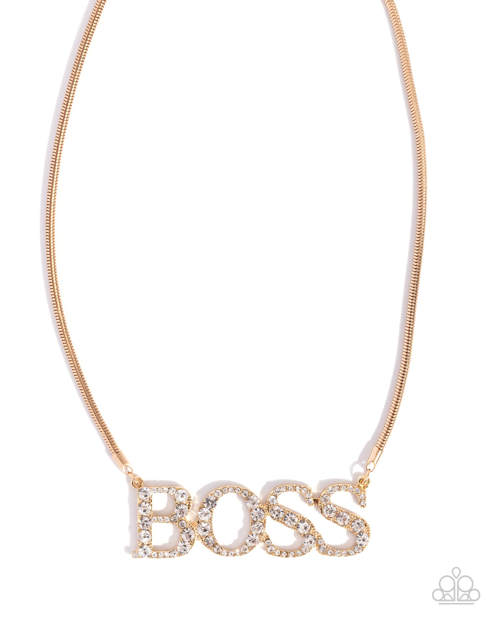 Dusted in white rhinestones, the gold letters spell out the word "BOSS" below the neckline from a gold snake chain for a corporate chic display. Features an adjustable clasp closure.
