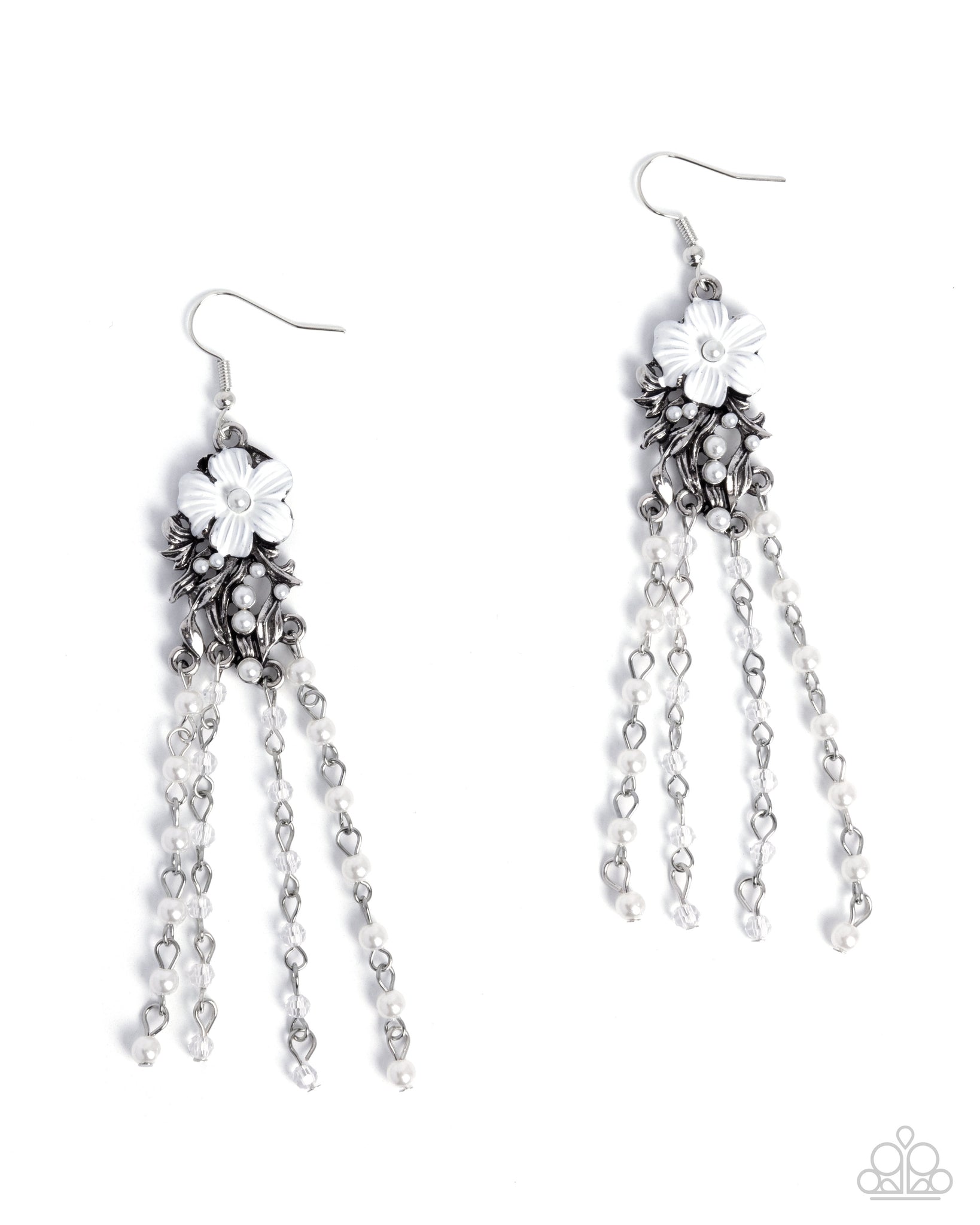 Dotted with a single white pearl, a textured white flower gives way to daintier white pearls embedded along curly silver leafy vines, which then gives way to a tassel of white pearls and faceted white beads for a fabulous fringe. Earring attaches to a standard fishhook fitting.