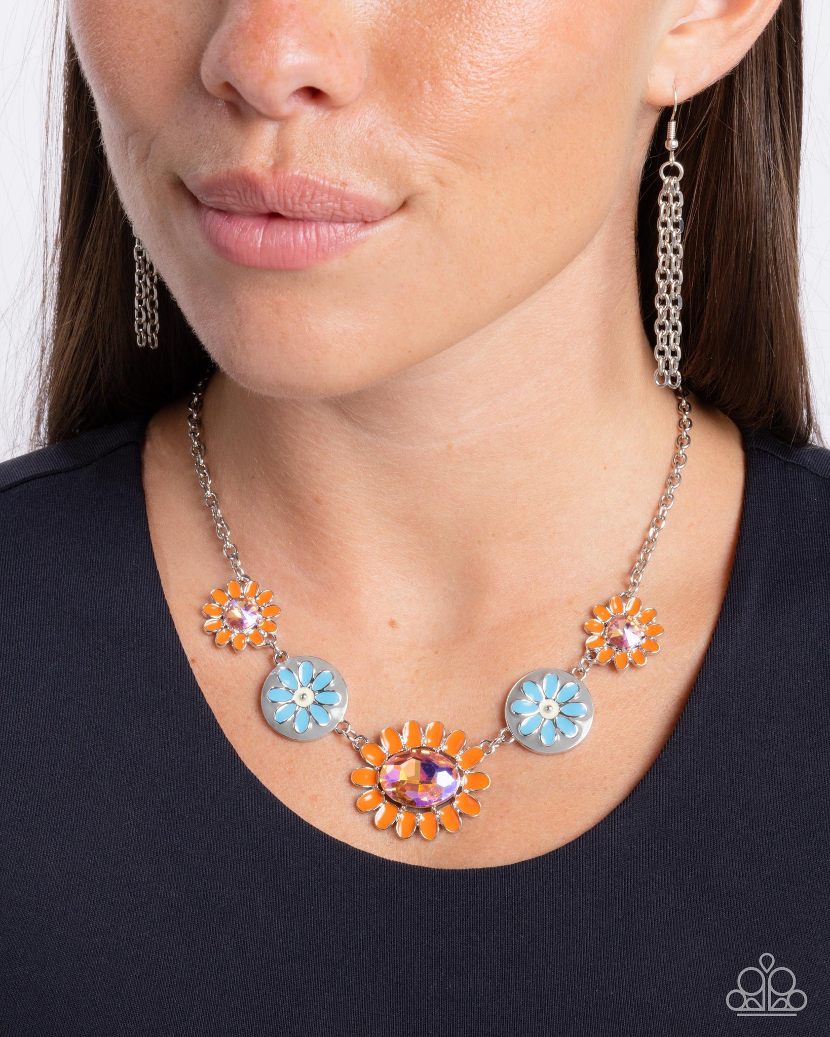 Featuring glassy orange rhinestone centers, vibrant orange-painted-petaled silver flowers alternate with silver-studded Primrose-painted flowers set against a backdrop of silver. The silver disc flowers feature vibrant blue-painted petals, framing an additional orange flower pendant with a larger orange UV shimmery oval gem center below the collar for a fierce floral fashion. Features an adjustable clasp closure.