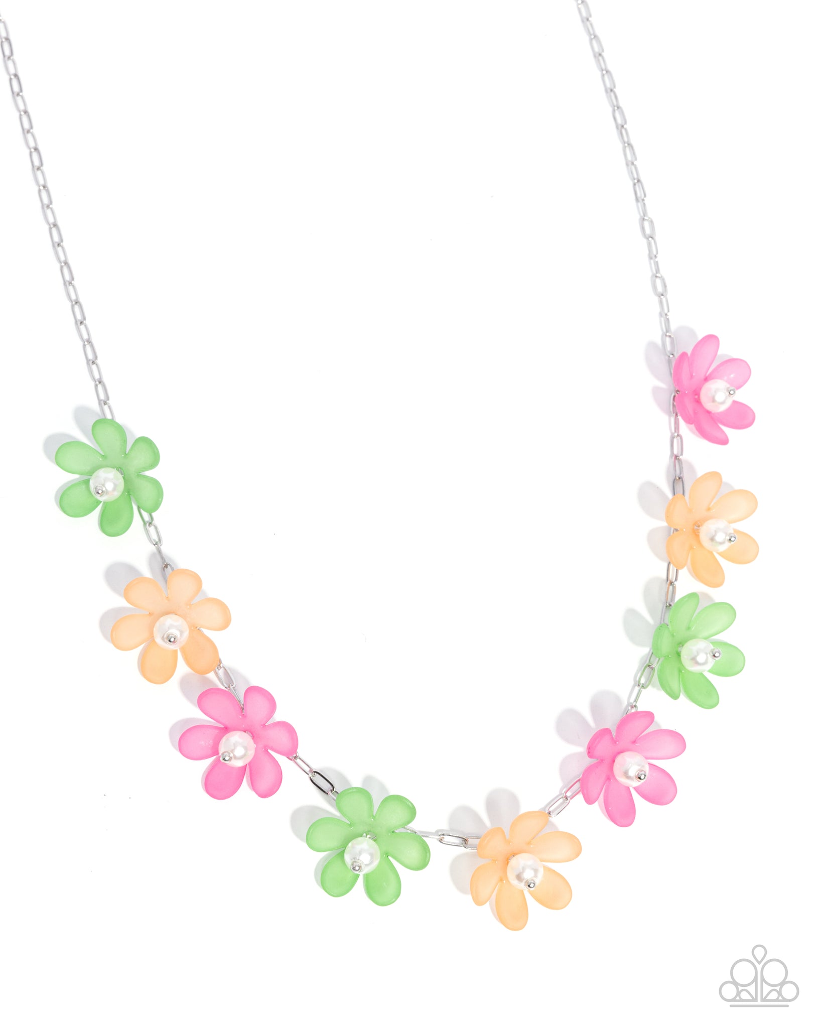 Dotted with white pearly centers, dainty sea glass-like pink, orange, and light green flowers bloom across a dainty silver paperclip chain along the collar, invoking a festive spirit. Features an adjustable clasp closure.