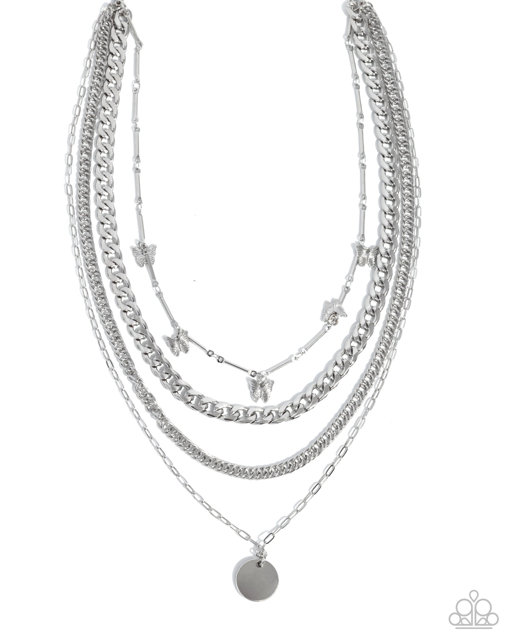 Featuring a high sheen finish, strands of dainty paperclip, elongated and classic curb, and cylindrical link silver chains cascade below the neckline, creating mismatched mesmerizing layers. A collection of subtly textured silver butterflies flutter along the uppermost chain while a silver disc glides along the lowermost chain for a whimsical finish. Features an adjustable clasp closure.