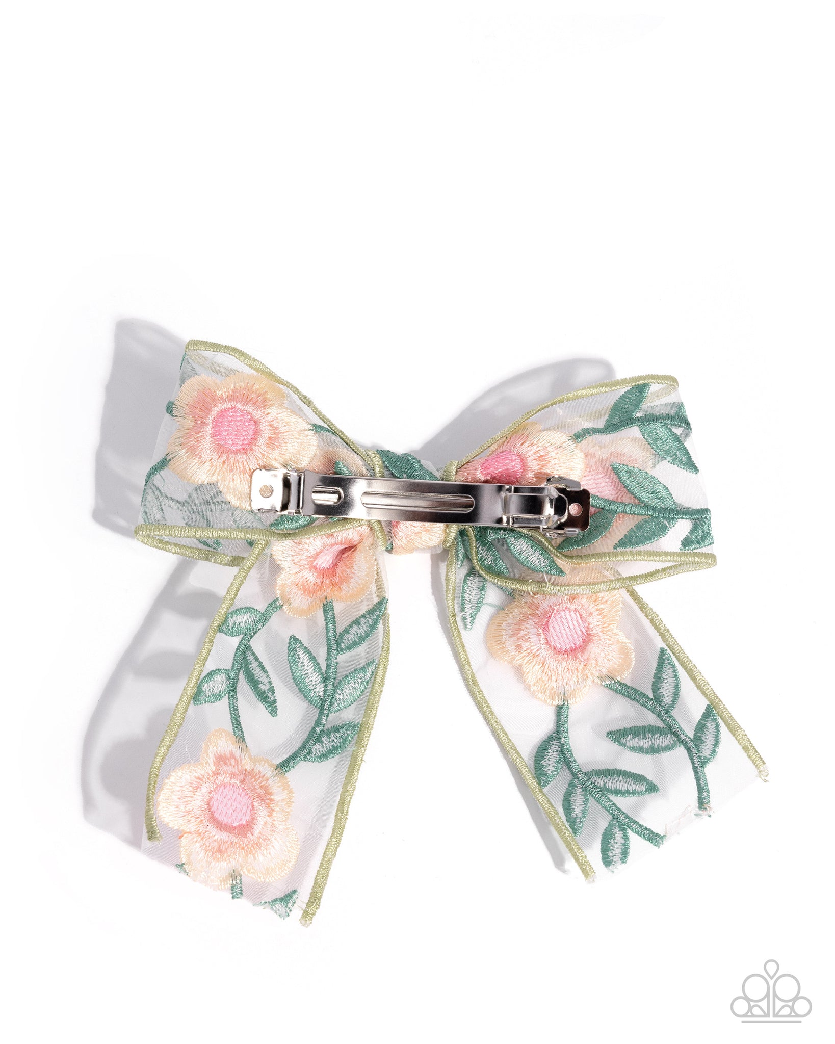 Featuring multicolored flowers and green stems and leaves, a transparent green ribbon ties into an adorable bow for a whimsical display. Features a standard hair clip on the back.