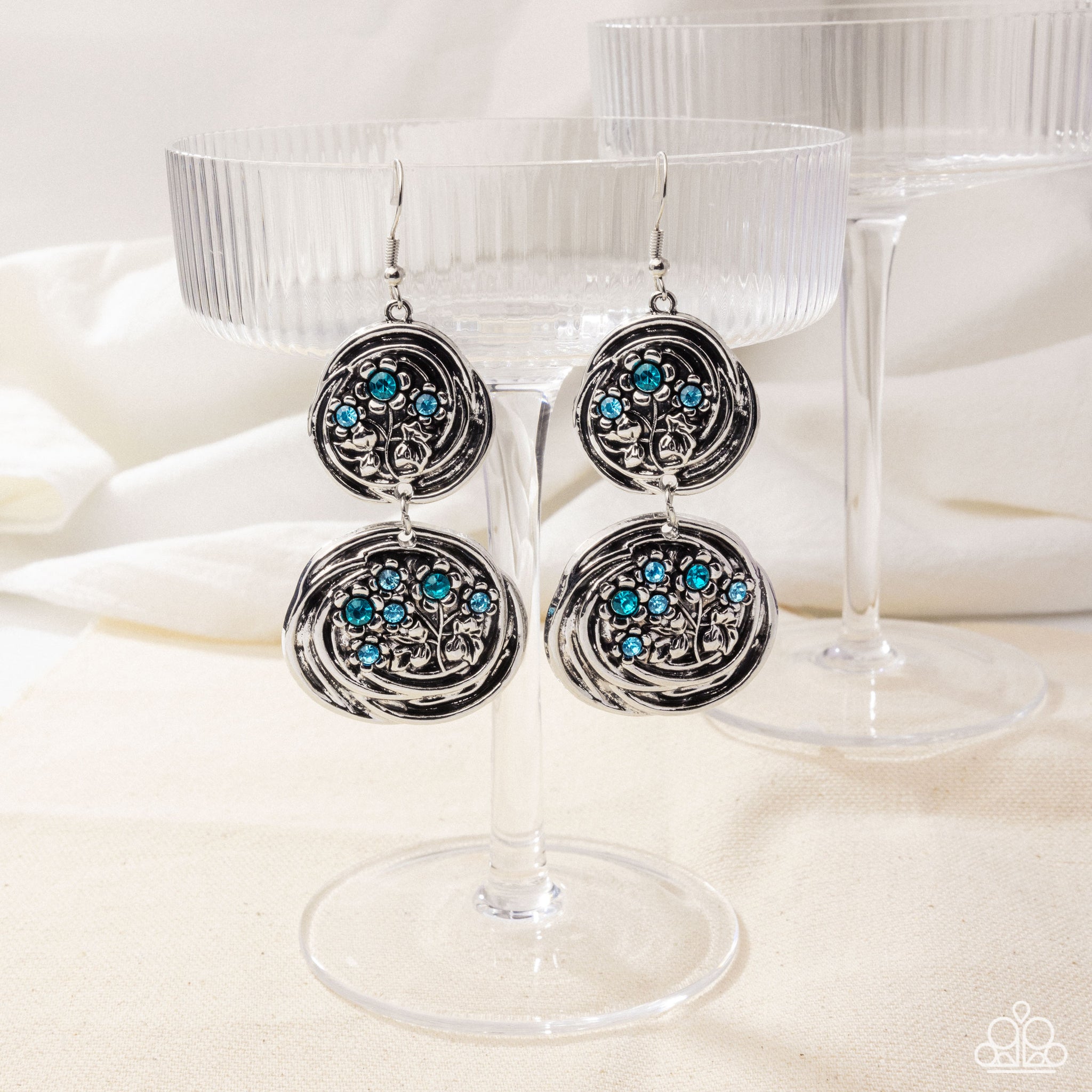 Sparkling aquamarine and blue zircon rhinestones are sprinkled along dainty silver bouquets, blooming atop swirl-textured mismatched silver discs radiating with whimsical leafy texture. Earring attaches to a standard fishhook fitting.