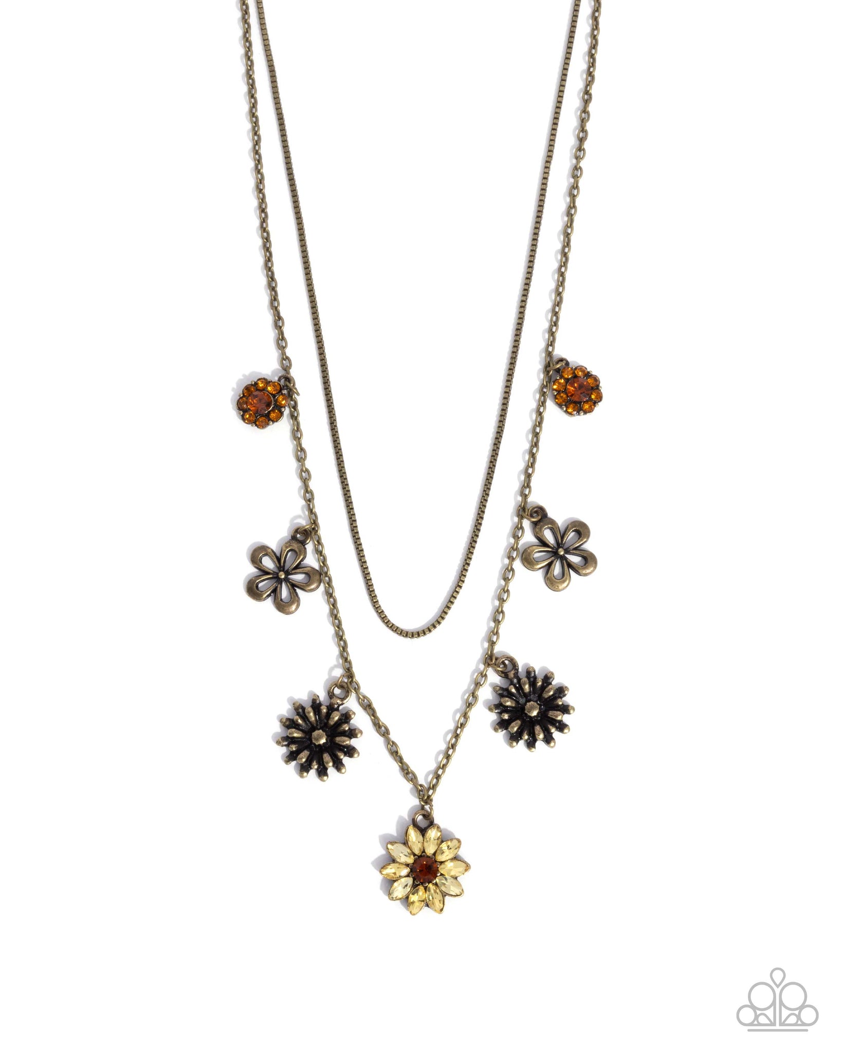 Infused along a brass cable chain, a collection of tea round rhinestone flowers, brass flowers featuring varying details, and a tea rhinestone-centered and marquise-cut yellow gem flower centerpiece that cascades below a brass box chain for a layered, whimsical display. Features an adjustable clasp closure.