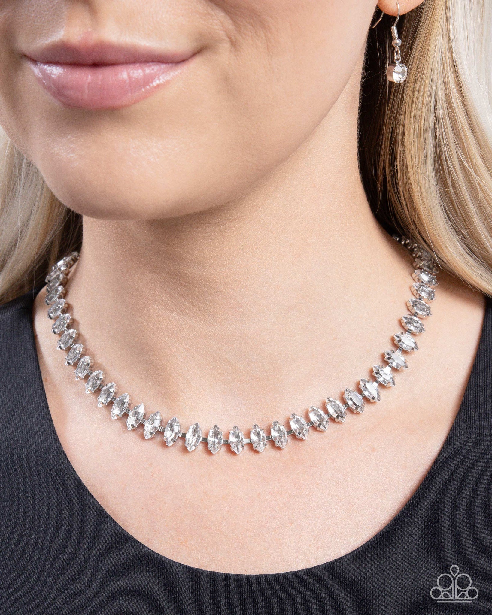 Pressed in silver-pronged fittings, a regal row of marquise-cut white gems interconnect below the collar, coalescing into an elegant eye-catching display. Features an adjustable clasp closure.