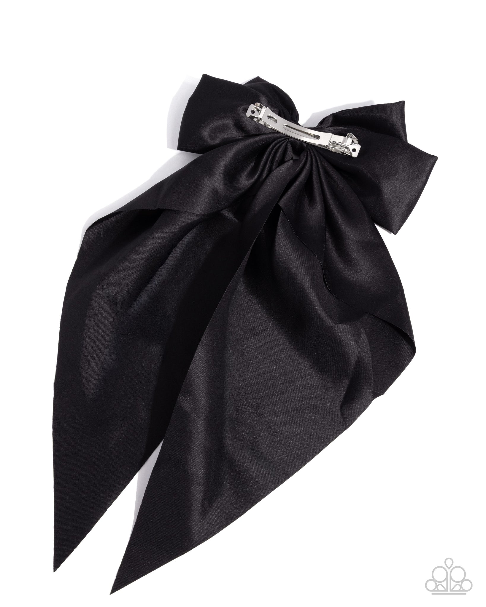 Featuring a satin finish, a black layered, elongated bow stands out. Features a standard hair clip on the back.