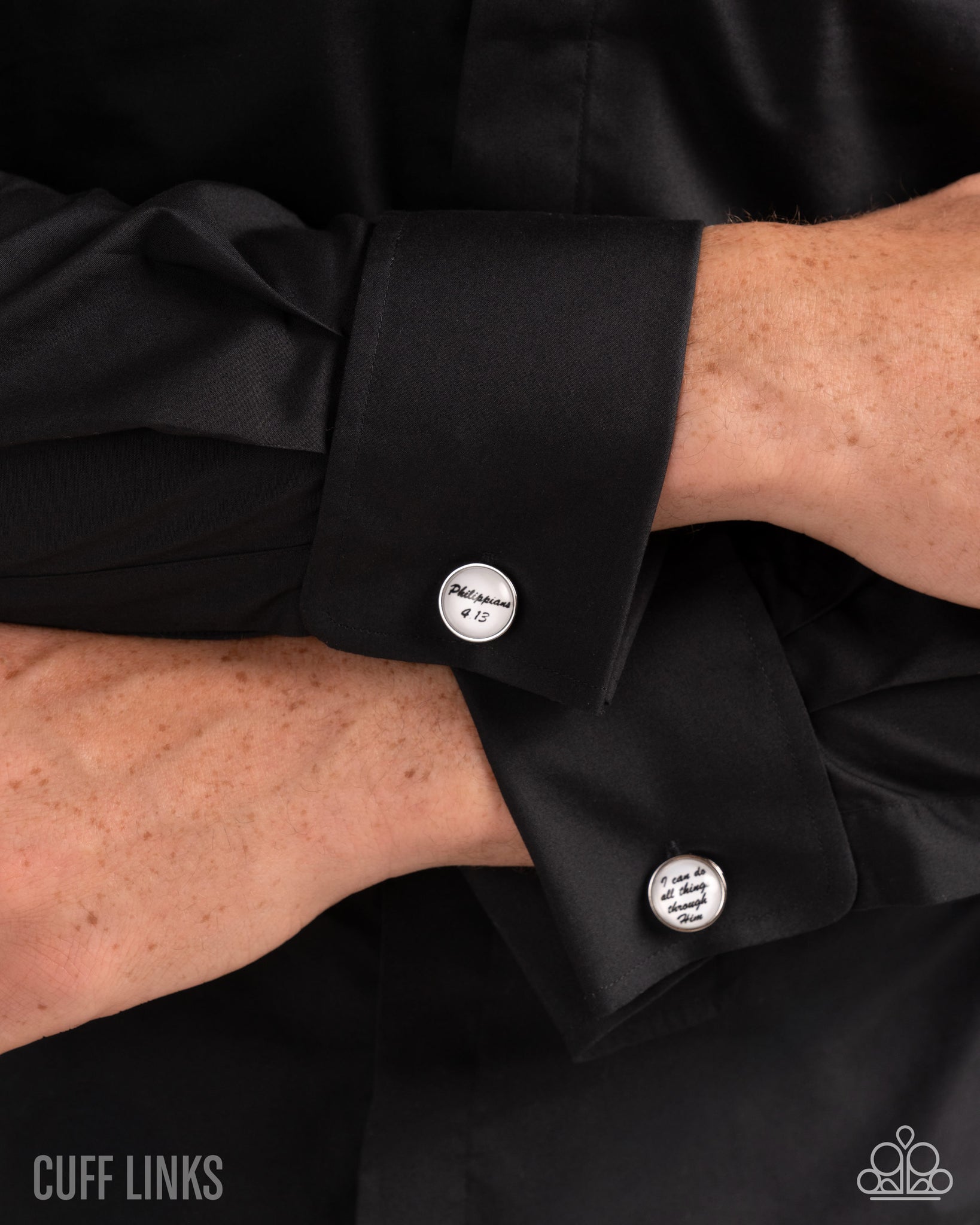 The scriptural phrase "I can do all things through Him" and the reference "Philippians 4:13" are stamped atop a white backdrop encased in a clear case and glistening silver fittings for an ironically inspiring cuff link.