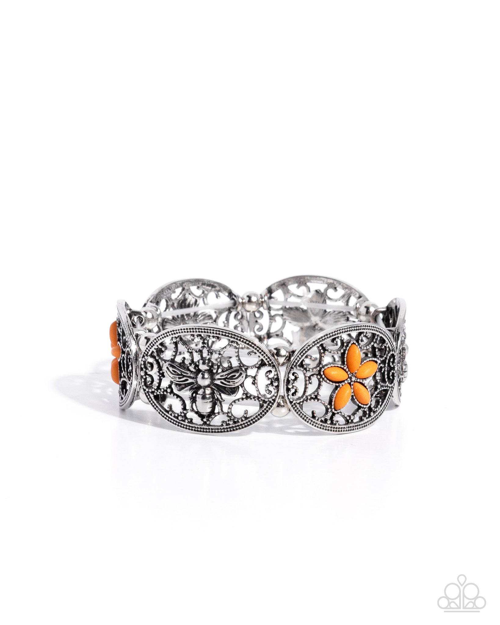 Dotted with marquise-cut orange stones and detailed silver bees, an airy collection of studded vine-like filigree filled silver frames are threaded along stretchy bands around the wrist for a seasonal pop of color. As the stone elements in this piece are natural, some color variation is normal.