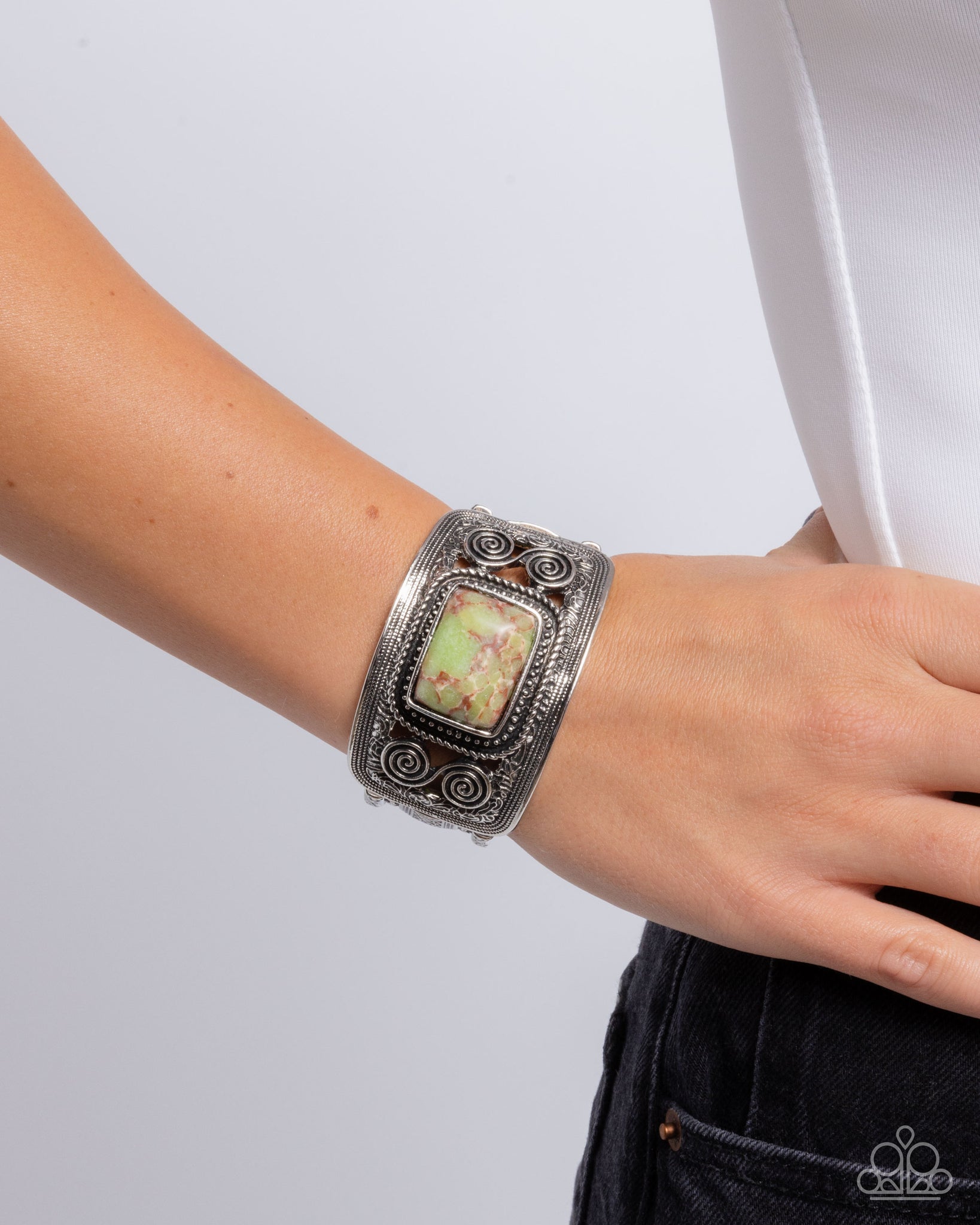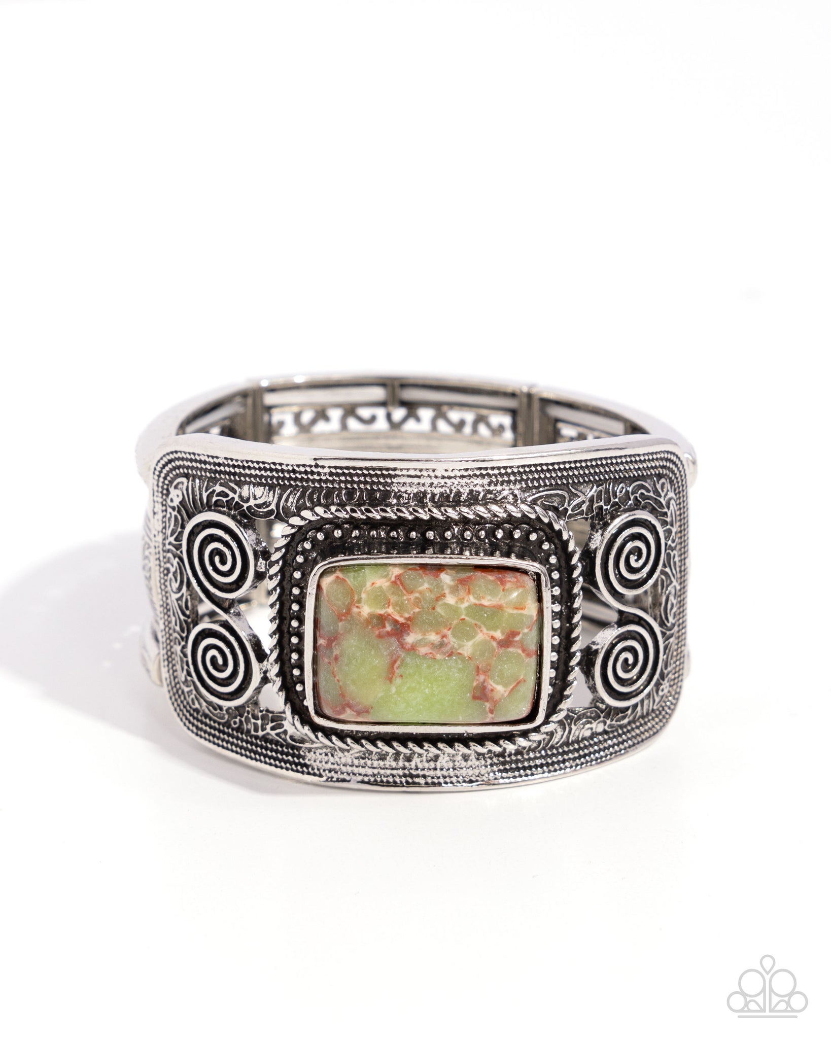 A chunky, square green faux stone is pressed into the center of an ornately detailed silver frame, featuring swirling patterns and studded accents, threaded along elastic stretchy bands, creating a determined, detailed display.