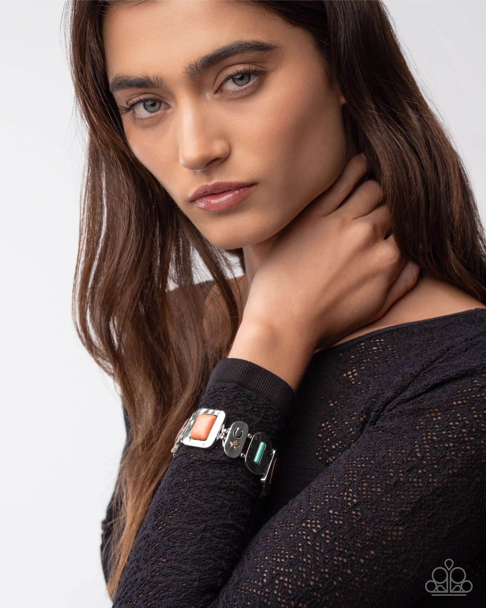 Infused along elastic stretchy bands, a collection of various-sized silver plates separated by stacked silver beads coalesce along the wrist. Featured on the various plates, eclectic materials and motifs including: a skinny turquoise stone, the stamped word "JOY" amongst various silver studs, a copper heart, a stamped horseshoe above a gold star, and an oversized Brandied Melon stone, stand out for a mismatched, mesmerizing look. As the stone elements in this piece are natural, some color variation is normal.