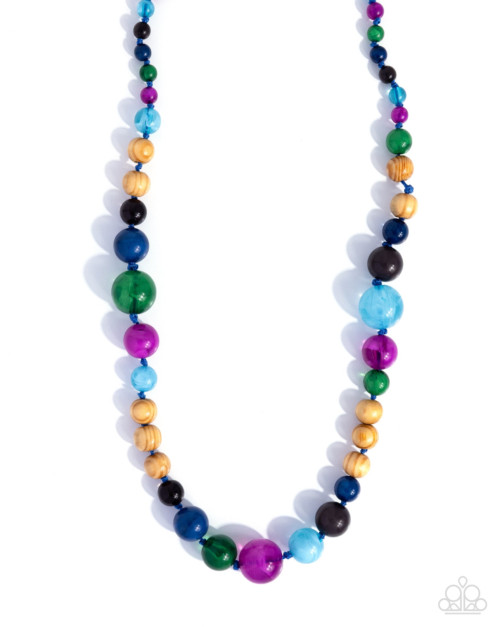 Infused along barely visible blue string, a collection of milky purple, green, black, and blue beads joins light brown wood beads along the neckline in a radically rustic pattern. Features an adjustable clasp closure.