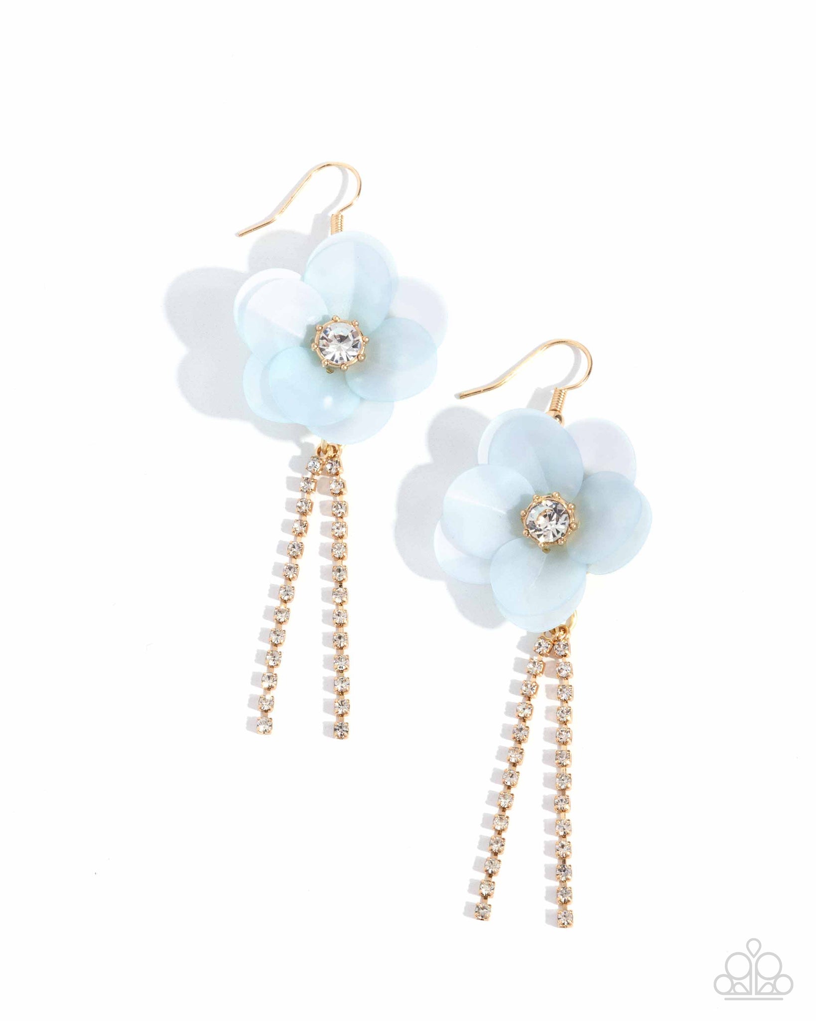 Featuring a white gem center, pressed in a gold floral pronged fitting, light blue sequin flower petals bloom from the ear giving way to a duo of white rhinestones pressed in gold square fittings for a whimsically, chic look. Earring attaches to a standard fishhook fitting.