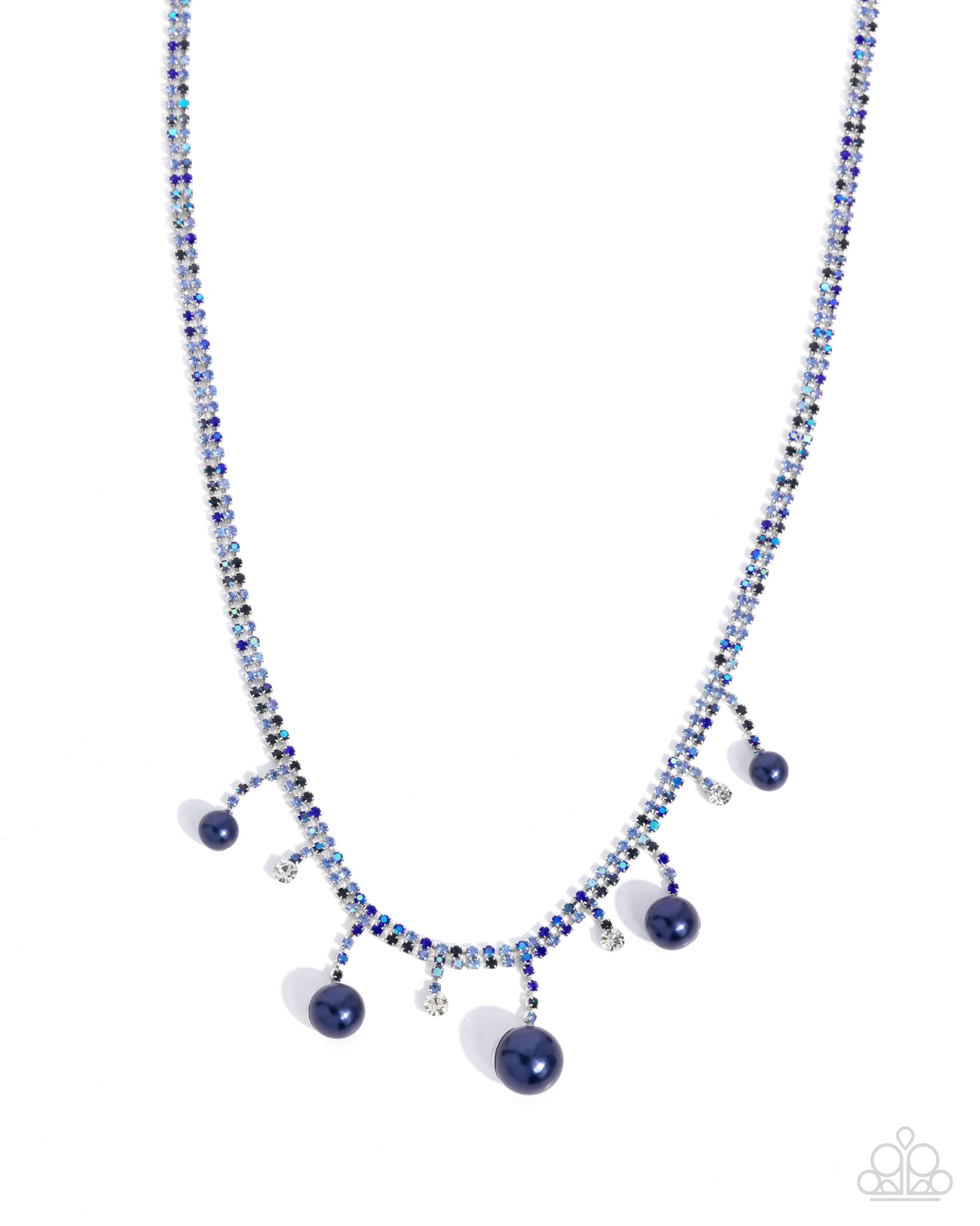 A doubled strand of various dainty blue multicolored and blue iridescent rhinestones in dainty square fittings coalesce around the collar. Faceted white gems alternate with Montana pearls in varying sizes as they drip from the dazzling row above from additional strands of blue multicolored rhinestones in square fittings for a ritzy finish. Features an adjustable clasp closure. Due to its prismatic palette, color may vary.