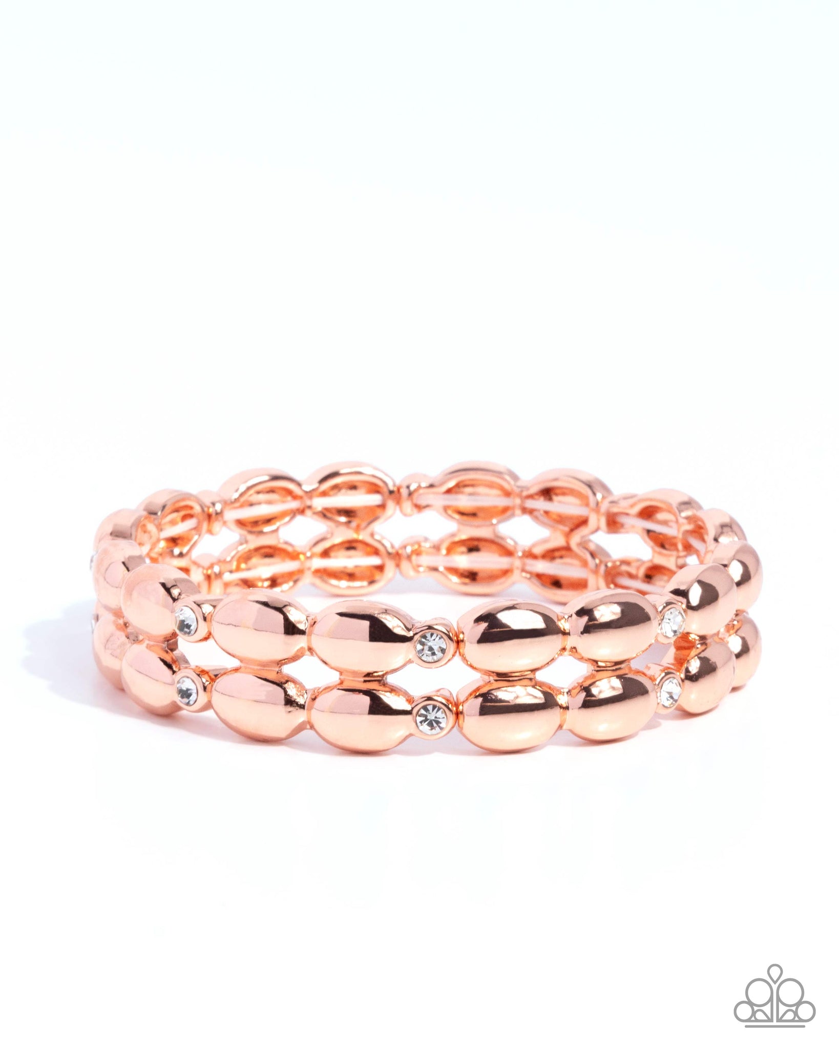 Infused along elastic stretchy bands, a collection of shiny copper oval beads, some that elongate to encapsulate dainty white rhinestones stack atop one another for an attention-grabbing display of shimmer and shine.
