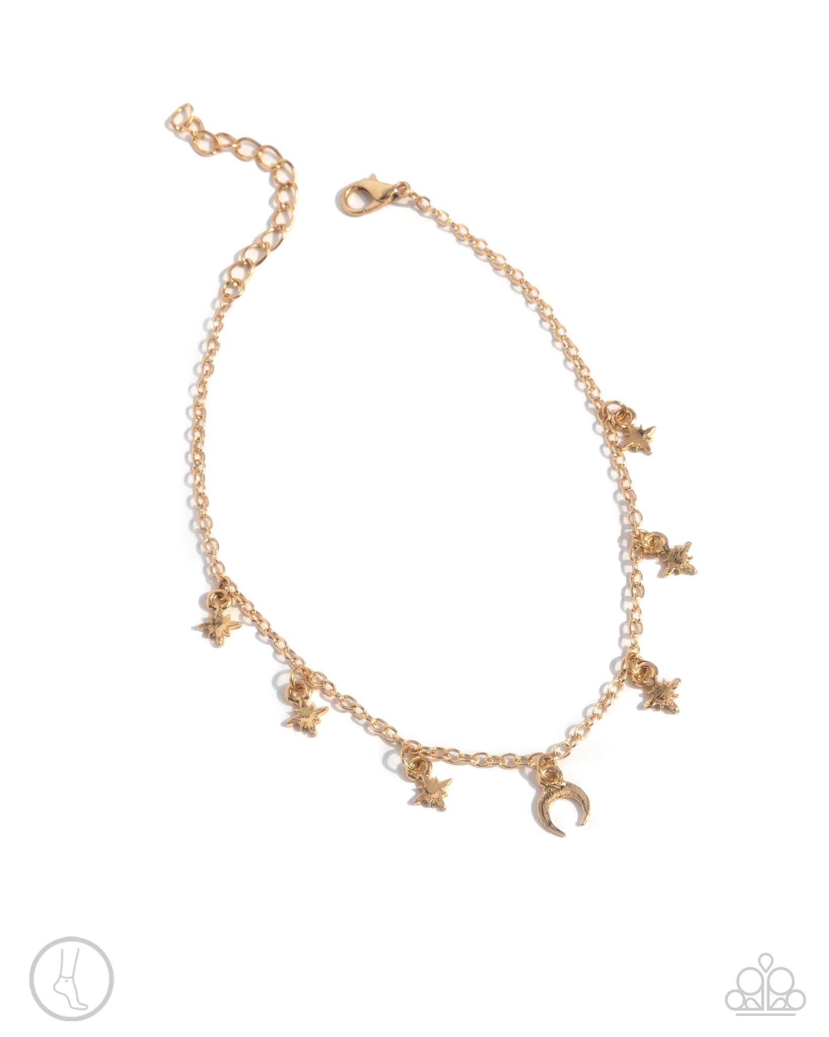 Swaying from a classic gold chain, a collection of dainty gold charms including three-dimensional stars and a tilted crescent moon coalesce around the ankle for a celestially chic display. Features an adjustable clasp closure.