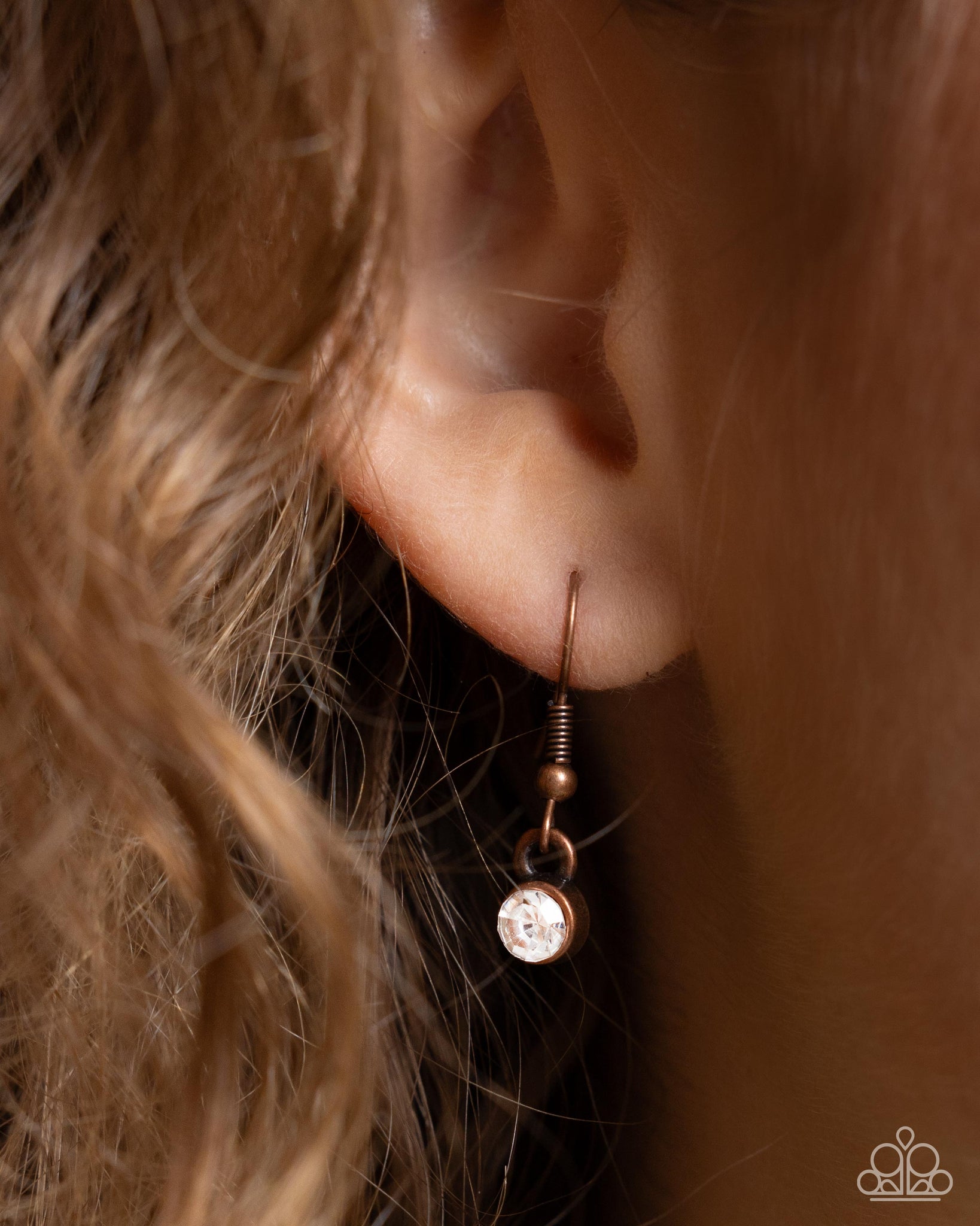 Gliding along a dainty copper chain, a copper sunburst pendant, embellished with glistening white rhinestones creates a simply sunny statement. Features an adjustable clasp closure. Sold as one individual necklace. Includes one pair of matching earrings.