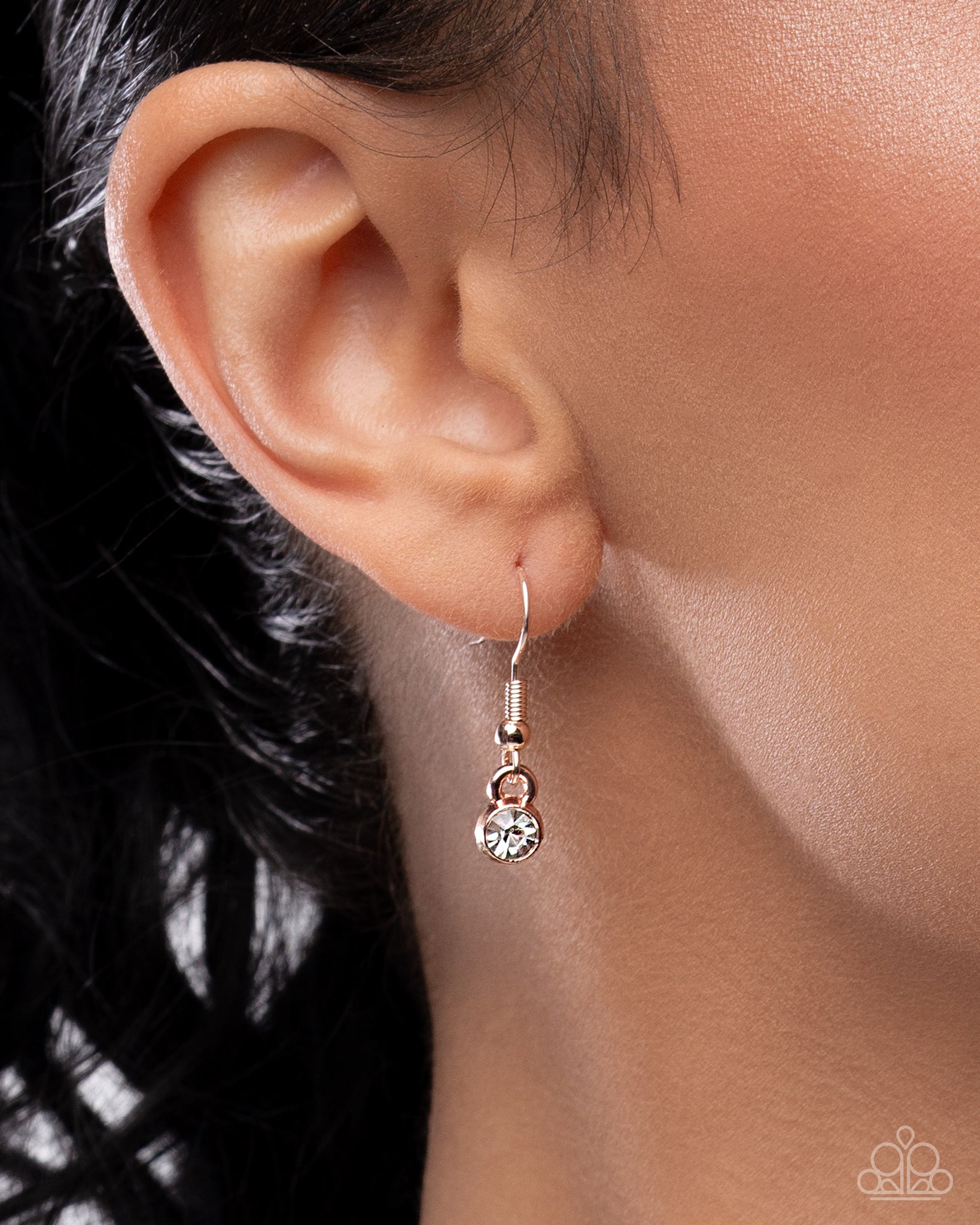 A tourist-inspired collection of rose gold charms, including a croissant, taxi, heart, and airplane, swings from the bottom of a rose gold hoop from an extended rose gold chain for a well-traveled display. A lobster clasp hangs at the bottom of the design to allow a name badge or other item to be attached. Features an adjustable clasp closure.