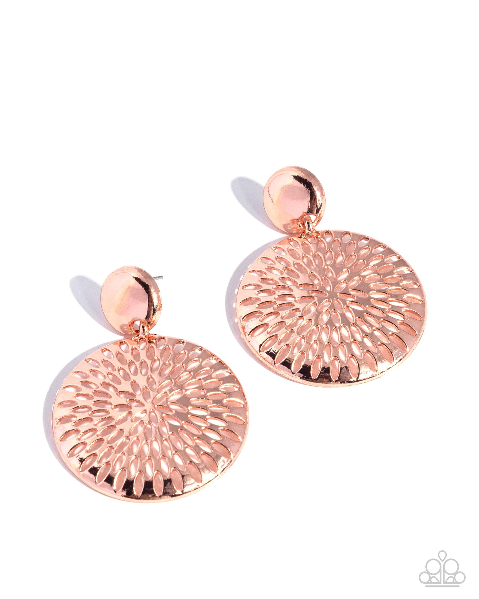 Rippling with floral, stenciled detail, an oversized shiny copper frame swings from the ear from a solitaire shiny copper post for a sensationally seasonal look. Earring attaches to a standard post fitting.